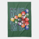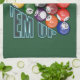 Rack Em Up for pool players and pool sharks. Racked billiard balls with a green pool table background.