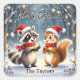 A sweet Christmas personalised sticker that features an illustration of a squirrel and racoon hanging Christmas lights in a whimsical folk art style festive forest.
