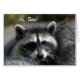 This juvenile racoon bandit looks up from his lunch, mouth still open, to say hello. The photograph shows a close-up of his face snuggled between the furry grey sides of his mother and sibling. The little dark eyes twinkle out at you from the black mask that runs across his face, with white whiskers, like a cat's, standing out against the black. White stripes show above and below the eyes, and the black nose starts a vertical black stripe running up the forehead to the black head. His little black ears are outlined in white. One little dark forepaw, just like a hand, is at his mouth ready to pop in a bit of cat food. Against the blurred background are written the words, "Hi, There!" in white script. He and his family of Mum and two siblings have come for a hand-out at my sister's house in Ocean Shores, WA. Copyright Gail Storrs 2011.