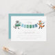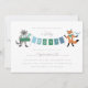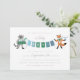 Blue and green "Boy!" banner held by illustrated racoon and fox on this sweet baby shower invitation. Editable background colours on the front and back.