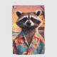 Funny Racoon wearing a hawaiian shirt on a beautiful beach.