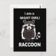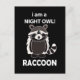 Racoon I am A Night Owl Funny Racoon Postcard original design by Nisha Prabhu. Unleash your inner night owl with our adorable "Racoon I am A Night Owl" postcard! This charming design features a playful racoon peeking out from behind a moonlit backdrop, perfectly capturing the whimsy of nocturnal adventures. Whether you're sending a greeting to a fellow night owl or just want to brighten someone’s day with a touch of humour, this postcard is sure to bring a smile! Crafted for night lovers and racoon enthusiasts alike. It’s perfect for any occasion and pairs wonderfully with a witty note or a simple hello.