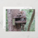 Postcard design features a photograph of two raccoons, quietly raiding a bird feeder.