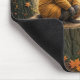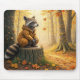 A racoon wearing an orange jacket sits on a tree stump in a forest filled with vibrant autumn foliage