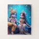 The puzzle pieces showcase the divine duo adorned in vibrant traditional attire, with Radha's exquisite grace complementing Krishna's divine charm. The celestial backdrop, filled with symbolic elements such as peacock feathers and lotus flowers, adds to the enchantment of the scene.