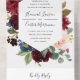 Our Radiant Bloom wedding invitation surrounds your wedding day details with a geometric frame of painted watercolor flowers in burgundy marsala, blush pink and navy blue, with green botanical foliage and eucalyptus leaves. A beautiful choice in lush, saturated colours for fall or winter weddings, this design features a detachable RSVP section with a QR code for guests to scan.