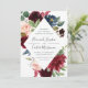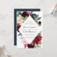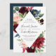 Our Radiant Bloom wedding invitation surrounds your wedding details with a geometric frame of painted watercolor flowers in burgundy marsala, blush pink and navy blue, with green eucalyptus foliage. A modern yet organic choice in green and white with lush, colourful botanicals and handwritten lettering.