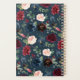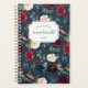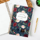 Chic floral personalised planner features a background pattern of watercolor flowers in burgundy marsala, blush pink and navy blue, with lush green foliage and eucalyptus leaves on a rich navy background. Personalise with three lines of custom text.