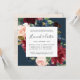 Our Radiant Bloom floral rehearsal dinner invitation in a unique square format frames your wedding ceremony rehearsal and dinner details with painted watercolor flowers in blush pink, burgundy marsala and navy blue, with green eucalyptus foliage against a rich navy background.