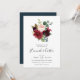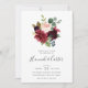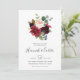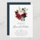 Elegant floral wedding invitations feature a posy of watercolor flowers in burgundy marsala and blush pink, with navy blue buds and green eucalyptus foliage. Personalise with your wedding details beneath in a chic mix of block, serif and handwritten calligraphy typefaces.