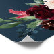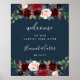 Welcome guests to your wedding with our Radiant Bloom poster, featuring jewel tone watercolor flowers and lush botanical greenery, with "welcome to our happily ever after," your names, and wedding date in a chic mix of modern block and hand lettered calligraphy typefaces on a rich navy blue background.
