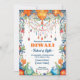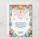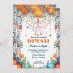 The front of the invitation features a crisp white background that serves as a clean canvas for vibrant Hindu-style decorations. Intricate patterns in warm oranges and yellows create a stunning frame for the text, with accents of blue and green adding a touch of freshness and contrast. The detailed ornamental border surrounds the event details, which are elegantly scripted in the centre, allowing the vibrant colours to pop. The back of the card continues the bright and festive theme, with space for customisable text and Diwali wishes, framed by the same intricate patterns. This design radiates warmth, joy, and tradition, perfect for celebrating the Festival of Lights in a bold and colourful way