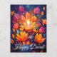 The Diwali card is a tapestry of vivid, post-impressionist artistry, a celebration of colour and light against a deep, enchanting sky-blue canvas. In the heart of the composition, a magnificent lotus unfurls, its petals painted in a lively palette of light orange, radiating a sense of warmth and vitality.