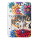 A radiant kitten with soft fur and bright blue eyes sits surrounded by vivid, geometric flowers bursting with bold colours and intricate symmetry. The striking contrast between the delicate kitten and the vibrant floral patterns creates a captivating blend of softness and dynamic visual energy.