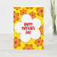 This card features a large white five-petal flower shape centered on a sunny yellow background, creating a bright focal point that feels like a warm hug ❤️. Inside the white flower, the words “HAPPY MOTHER’S DAY” sit in the middle in thick, hand-drawn red letters that look friendly and affectionate. Around the center, repeating orange flower shapes spread across the background, each with a red center that adds a cozy, caring touch. Slightly darker orange shading on the petals gives the pattern a gentle layered look, like the blooms are softly raised from the surface. Small pale-yellow circles are scattered between the flowers, adding a light, sprinkly sparkle 🌼. The overall palette of yellow, orange, red, and white feels sunny and close-knit, like sharing a fond glance across the table. The background is filled edge to edge with orange blossoms and pale-yellow dots surrounding the central white flower.