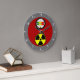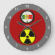 The clock face has a red brushed metal look and a radiation sticker and red button below the radiation counter.