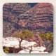 A photograph of a stone formation with a tree growing out from one of the cracks. A small observer is perched near the point of the formation, looking out onto the canyon. The background is a red stone wall descending deep into the earth, with spots of green growth scattered about.
