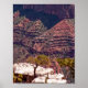 A photograph of a stone formation with a tree growing out from one of the cracks. A small observer is perched near the point of the formation, looking out onto the canyon. The background is a red stone wall descending deep into the earth, with spots of green growth scattered about.