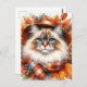Postcard features an adorable rag doll cat wearing a scarf and hat, surrounded by fall leaves and decor.