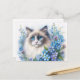 This floral Ragdoll postcard features a vibrant floral watercolor illustration of the long-haired, blue-eyed cat framed by a delicate wreath of soft blue and lavender forget-me-not flowers. The cat’s lifelike fur, expressive crystal-blue eyes, and the lush arrangement of blossoms create a gentle, heartwarming aesthetic that blends realism with floral fantasy.