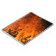 A pile of silhouetted sticks on the left side of the image burn hotly. Mesmerising dark orange and yellow flames fill most of the photograph's frame. Wind pushes the torrent of fire so it angles diagonally up to the right.