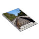 Railroad train tracks photo. With a plain rectangular area for personalizable text.