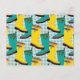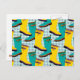 Colourful galoshes or rubber rain boots in bright yellow and turquoise are featured in this whimsical pattern set against tiled abstract umbrella shapes.