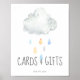 This rain cloud boy baby shower cards and gifts sign is perfect for a modern baby shower or baby sprinkle. The cute and simple design features pastel teal, light blue, yellow and grey watercolor raindrops falling from a soft grey cloud.