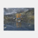 A short-focus render of a dark, rainy day in a northern mountain glen. In the background are grey-brown hills and a willow tree with its yellow fall leaves on an island in a silvery lake. In the foreground are raindrops frozen in midair, with one in the middle bringing the golden willow and its reflection into sharper focus.