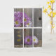 Raindrops on window with purple mum bouquet in rusty tin can for birthday.
