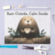 A charming and heartwarming digital illustration featuring a round, fluffy brown creature with a cream-colored face peeking out from a hole in the ground. The creature has small, dark eyes and a gentle expression as it holds a small white teacup filled with dark coffee or tea. Soft rain falls vertically against a clean white background, while a few dark green leaves sprout from the textured earth in the foreground.