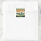 Abstract landscape scene of a mountain vista with rolling hills and a rain storm in orange, gold, blue, and cyan.