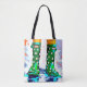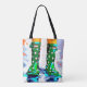 Artwork by Courtney Bindl Art, dual sized tote bag with green polka-dot rain boots splashing away!