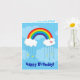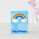 A Birthday card featuring a stunning vivid vector rainbow on a blue background. It curves to meet to white fluffy clouds on each side. The right cloud has a pink heart decorating it. It rain downs 4 yellow stars and 6 blue raindrops.