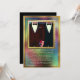 Rainbow and gay wedding invitation with the couple holding a red rose.