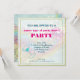 Generic party invitation. This exciting musical themed image is a funky retro design of a pastel coloured rainbow with dark multicolored music notes on pieces of sheet music exploding outward. Butterflies and paint splatters seem to burst forth from the centre. The background is a faded, dark green, vintage style, shabby grunge texture with faded handwriting. Would be an awesome purchase for music lovers of all kinds.