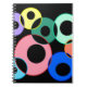 Simple colorful geometric pattern, rainbow colored circles intersecting on black background