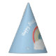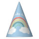 Cute rainbow birthday party design is pretty in soft watercolors on a blue background. Great for spring and summer birthdays.