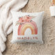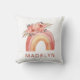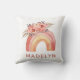 Personalise this chic and fashionable cushion showcasing a boho-inspired rainbow comprised of diverse earthy hues, alongside a vibrant assortment of flowers in shades of orange, pink, and peach. Customise it further by incorporating your own name.