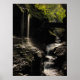 This scenic poster features Rainbow Bridge and Falls in Watkins Glen State Park south of Seneca Lake in the Finger Lakes Region of upstate New York. The park is dissected by a 400 foot deep narrow gorge cut through rock by Glen Creek. It was created by the movement of glaciers during the ice age, leaving behind a staircase of waterfalls, cascades, plunge pools and potholes encompassing nineteen waterfalls spaced along a trail roughly two miles long.