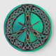 Celtic Knot Peace Sign Clock. A fosty, metallic mint green, lavender purple, silver and gold endless knot pattern in the shape of the classic peace sign. Celtic knots are a traditional Celtic art form, usually chraacterised by having no beginning and no end, that symbolise eternal love and the never-ending cycle of life. They have been found to be a favourite symbol in many cultures and civilisations around the world and with many practitioners of magic or mysticism today. The peace sign is a Universally recognised symbol of peace.