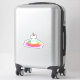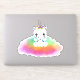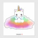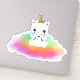 A gorgeous unicorn sticker featuring a cute little baby unicorn with a shiny golden horn, sitting on a rainbow cloud. She also has a small pair of wings.