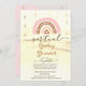 Unique virtual girl baby shower invitation featuring a rainbow, stars, and clouds.