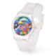 I only have one complaint. I ordered the watch with clear case and strap, and what was sent was white case and strap. I'm going to keep it because 1) it looks very nice in white, and 2) it would take too long to get a replacement made and sent in time for my occasion. Aside from the mix up with the color, the watch does look very good in white. The purple dial is actually sparkly which did not show in the online images. That was a nice surprise. If you like Swatch watches this is very similar to those. It's 33.6mm in diameter, 10.5mm thick, and 40.6mm lug to lug. Stainless steel case back says 3ATM/30m WR, so no swimming or showering or submerging this one. If you like Woodstock, this is a great choice.