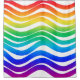 The shower curtain has a bold thick wavy line drawn horizontally across the curtain. It's in rainbow colours starting with red in the top green along the middle and blue and purple in the bottom. It’s a striking addition to any bathroom, for anyone who wants to make a statement. The overall background is white.