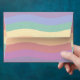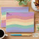 Wavy line rainbow colours of red, purple, violet, blue, orange, yellow, and green over a subtly patterned background.