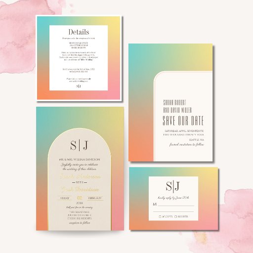 Pastel gradient in blue pink yellow retro style with monogram and broad golden border foil whimsical elegant design. This card is easily editable. If you need help with the customisation of this card or you need more matching products for this collection kindly message me via Zazzle.