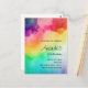Birthday postcard invitation with a watercolor background featuring colours of the rainbow.