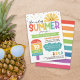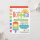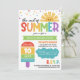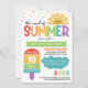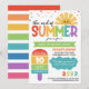 Sunny and colourful end of summer back to school party invitation with a happy sun, a striped rainbow ice cream and bright colours.