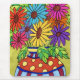 This designer striped and polka-dotted vase abounds with colourful daisies in a rainbow of colours in this uplifting springtime image.